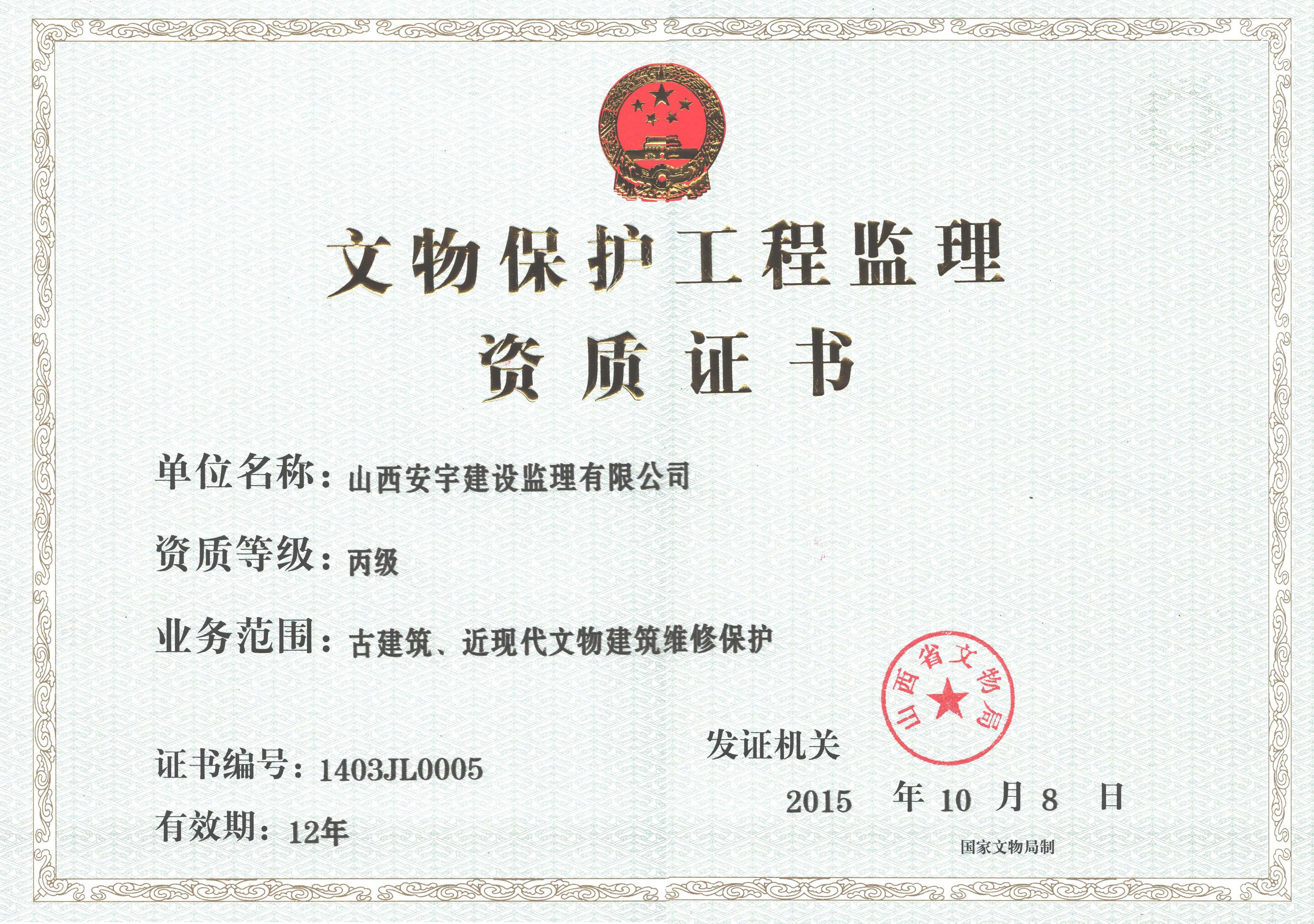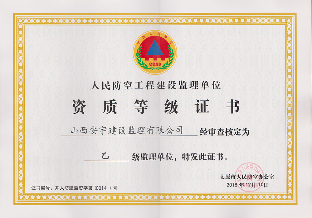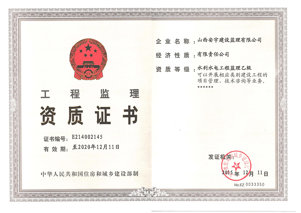 企業(yè)注冊(cè)資金1000萬(wàn)元,具有房屋建筑工程甲級(jí),市政公用工程甲級(jí)、冶煉工程甲級(jí)、化工石油工程甲級(jí),水利水電工程乙級(jí),文物保護(hù)工程丙級(jí)監(jiān)理資質(zhì)。