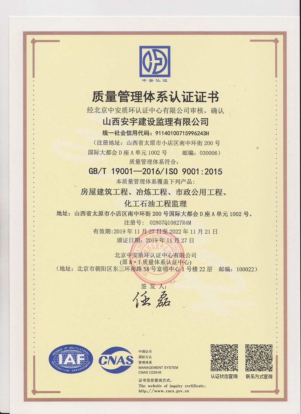 山西安宇建設(shè)監(jiān)理有限公司成立于二○○○年四月,資質(zhì)等級(jí)甲級(jí),具有獨(dú)立法人資格,可獨(dú)立承擔(dān)民事責(zé) 任的專業(yè)性監(jiān)理公司。是山西省和太原市建設(shè)監(jiān)理協(xié)會(huì)常務(wù)理事會(huì)員單位。公司自成立以來(lái)多次被評(píng)為“山西省工程監(jiān)理先進(jìn)企業(yè)”,并通過(guò)了GB/T 19001—2008/ISO9001∶2008質(zhì)量認(rèn)證。